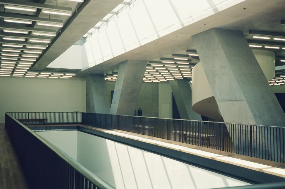 The architecture was designed by Herzog & De Meuron. Open space spanning multiple levels help make each level a larger space and allowing natural light to shine through. The concrete structure of the building itself is exposed without painting. What visitors see is the raw structure instead of decorated, rectangular spaces.